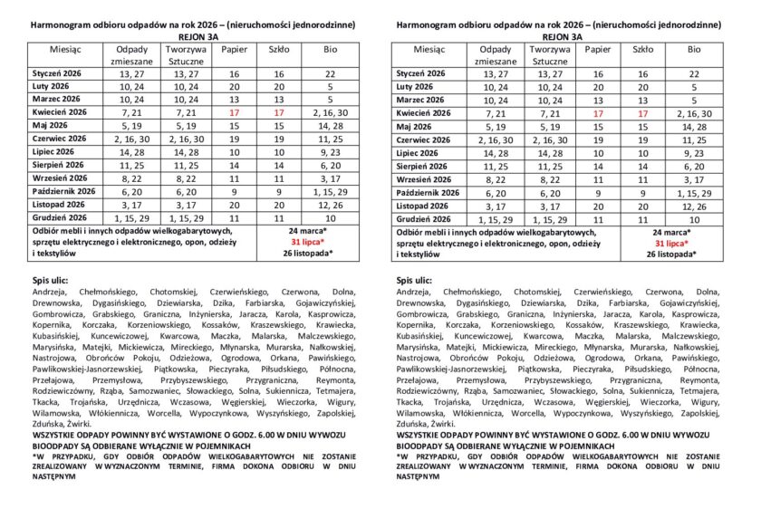 Harmonogram odbioru odpadów na rok 2026 – (nieruchomości jednorodzinne) REJON 3A